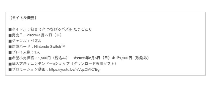 クリプトン・フューチャー・メディア株式会社(本社:北海道札幌市、代表取締役:伊藤博之、以下クリプトン)は、自社が企画から開発までの全てを手掛けたNintendo Switch用パズルゲーム「初音ミク つなげるパズル たまごとり」を、2022年1月27日(木)にリリースいたしました。本パズルゲームはダウンロード専用ソフトで、ニンテンドーeショップにてご購入いただけます。本日より2月6日(日)までの期間限定で、リリース記念セールを実施。期間中は20%オフとなる1,200円(税込み)で販売いたします。