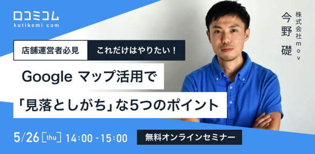 店舗運営者必見!Googleマップ活用で「見落としがち」な5つのポイントについて語る無料セミナーを口コミコムが開催【5/26(木)オンライン】