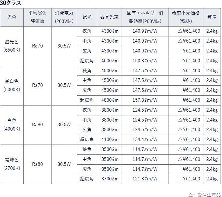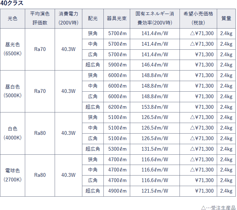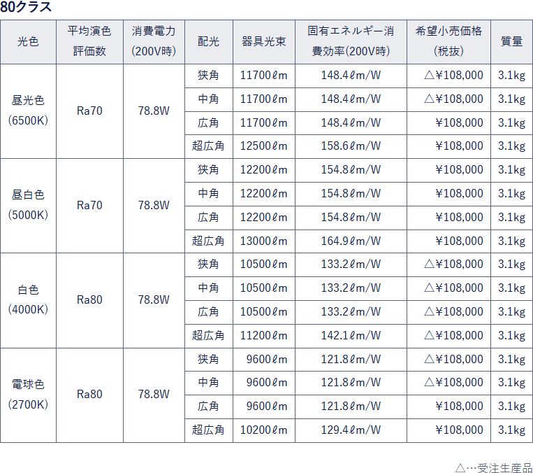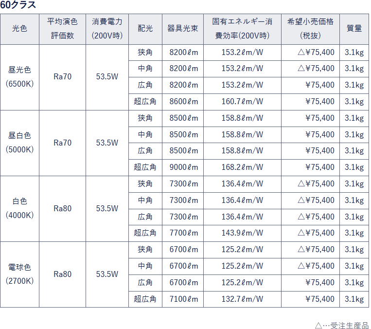 - 狭角タイプでも60クラス〜80クラスの昼白色を中心に150リットルm/W以上を実現しています。