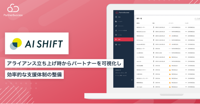 代理店販売で業績を伸ばすPRM(※1)-代理店連携管理クラウド「PartnerSuccess」を開発運営するパートナーサクセス株式会社(本社:東京都港区、代表取締役 永田雅裕、以下「パートナーサクセス」)は株式会社AI Shift(本社:東京都渋谷区、代表取締役社長:米山 結人、以下「AI Shift」)に「PartnerSuccess」を導入頂きました。