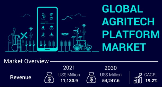 アグリテックプラットフォームの世界市場は、2030年には54,247.6百万米ドルに達すると予測されています。同市場は、予測期間中に19.2%のCAGRを記録すると予測されています。