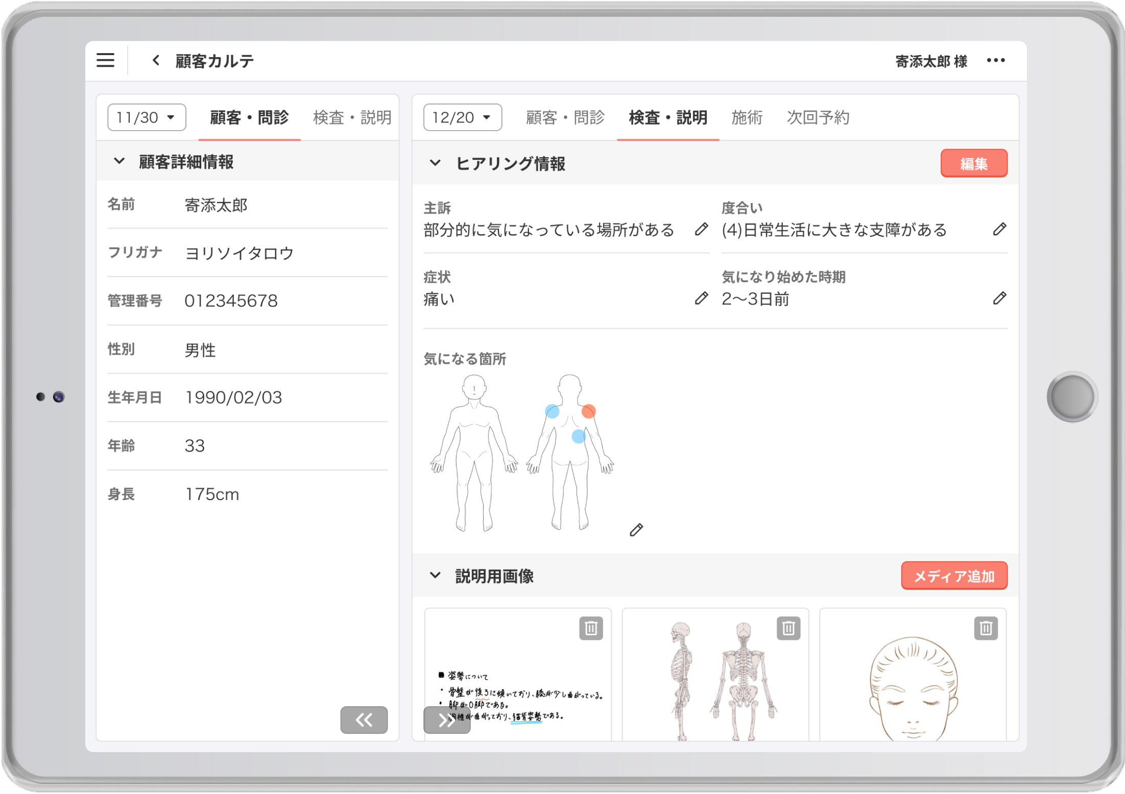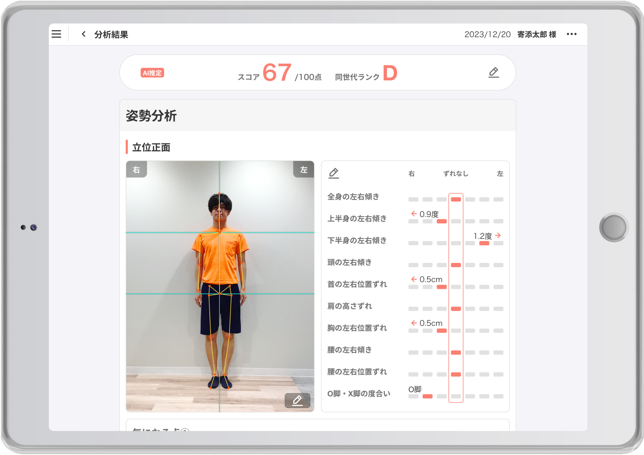 ■ カルティ シセイカルテタブレットで数枚の全身写真を撮影するだけで、AIが姿勢を分析し、スコアやグラフでわかりやすく可視化するシステムです。客観的かつパーソナライズされた分析結果に基づき接客を行うことで、顧客の納得感や興味を醸成し、施術提案の説得力向上に貢献します。