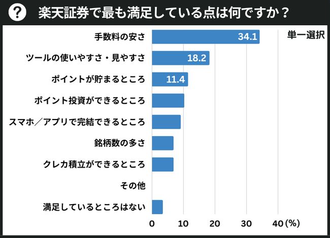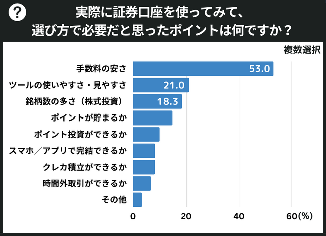 その後は、「ツールの使いやすさ・見やすさ」が21%、「銘柄数の多さ」が18.3%と続きます。ポイントが貯まることよりも、ツールの使いやすさのほうが重要視されることが分かりました。