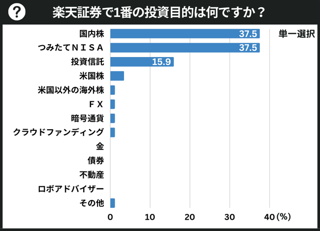 SBI証券での投資目的は、1位が国内株が72.3%、2位が投資信託28.7%だったのに対し、楽天証券は1位が国内株53.4%、2位がつみたてNISA47.7%と、つみたてNISAの利用割合が楽天証券のほうが多いことが分かった。