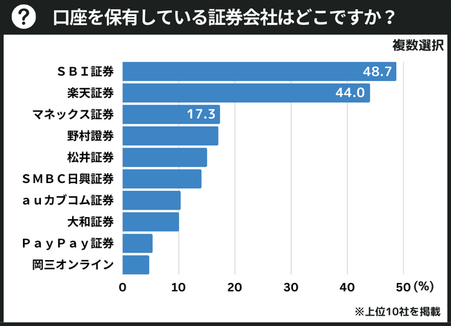 「口座を保有している証券会社はどこですか?」という設問に対し、1位がSBI証券(48.7%)、2位は楽天証券(44.0%)、3位はマネックス証券(17.3%)でした。