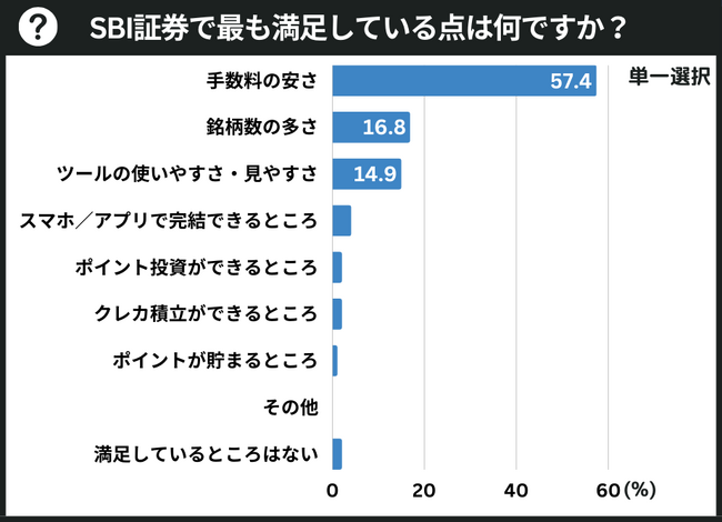 SBI証券と楽天証券の満足している点は、両社とも手数料の安さ。2つ目の満足度のポイントは、SBI証券は銘柄数の多さに対し、楽天証券はツールの使いやすさや見やすさ。