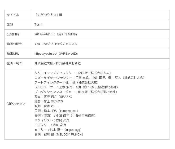 江崎グリコ株式会社は、ロングセラーブランド「プッチンプリン」のイメージキャラクターに、日本を代表するアーティストのToshlさんを起用し、新WEB-CM「こだわり3つ」篇を4月15日(月)午前10時よりYouTubeグリコ公式チャンネル(https://www.youtube.com/user/glicowebnet)にて公開いたします。