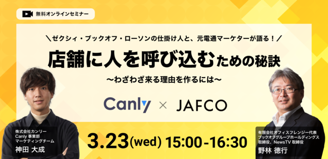 Googleビジネスプロフィール(旧・Googleマイビジネス)・HP・各SNSの一括管理サービス「Canly(カンリー)」の開発・提供を行う株式会社カンリー(所在地:東京都渋谷区、代表取締役:辰巳 衛,秋山 祐太朗)は、2022年3月23日(水)にジャフコ グループ株式会社との共催ウェビナー『〜わざわざ来る理由を作るには〜 店舗に人を呼び込むための秘訣』を開催することとなりましたのでご案内いたします。