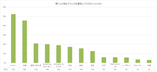 朝によく飲むドリンク1位は「コーヒー」。近年人気が高まっている「白湯」も約50%になっています。