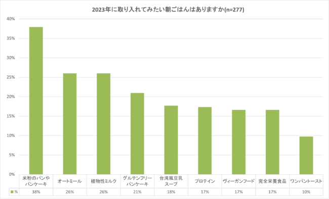 2023年取り入れたい朝ごはんとして「米粉のパンやパンケーキ」が1位になりました。今回のアンケート調査では、小麦価格の高騰により価格変動が少ないお米にシフトしているという回答もあり、米粉人気にはその影響もあるのではないかと推測されます。その他、ここ数年で人気が高まっている「オートミール」、「植物性ミルク」など栄養を手軽に取り入れられるメニューや、米粉、オートミール、グルテンフリーパンケーキ、豆乳スープなどに共通する「グルテンフリー」への意識の高まりも見受けられます。