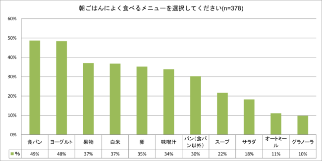 よく食べる朝ごはんメニュー1位は「食パン」。ヨーグルトや果物など手軽に取り入れられる食材も上位になっています。
