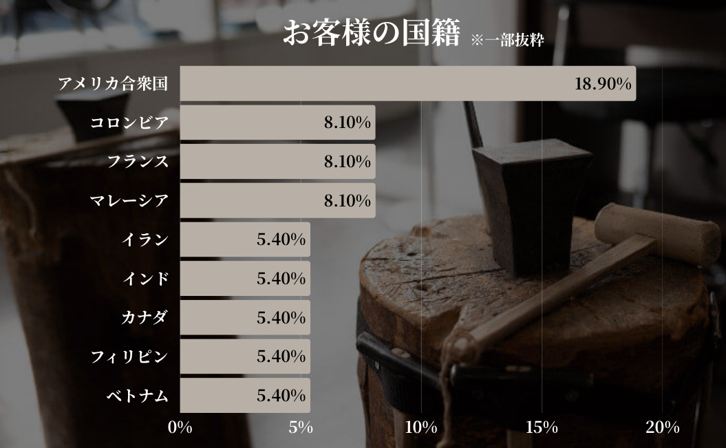 アメリカを中心に、フランスやイギリスなどのヨーロッパ、マレーシアやベトナムといったアジア、コロンビアなどの南米地域まで、幅広い国からお客様が来店していることが分かりました。
