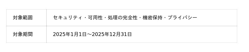 本報告書をご覧いただくことで、2025年1月から2025年12月末までの1年間に渡って、セキュリティ・可用性・処理の完全性・機密保持・プライバシーに関する内部統制が継続的に有効であることをご確認いただけます。