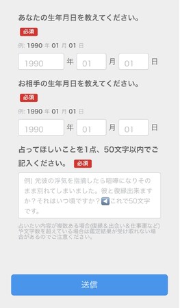 8.占ってほしい相手との二人の生年月日と、詳しいご相談内を50文字以内でご入力下さい!