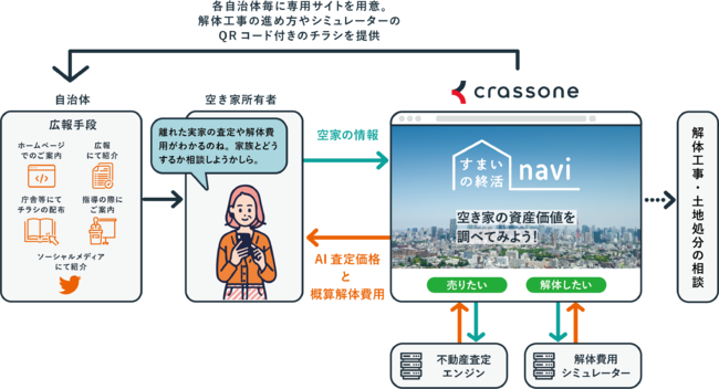 スマートフォン等から土地建物の面積や最寄り駅、接する道の幅などの条件を入力することで、「解体費用」と解体後の「土地売却査定価格」の概算額を手軽に無料で把握することができ、「解体費用がどのくらいか分からない」といった情報不足の解消や、解体後の土地売却の見通しが立たないために空き家の解体に踏み切れない所有者の意思決定の後押しを行います。