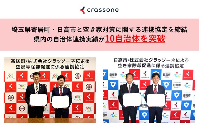 解体工事の一括見積もりWebサービス「クラッソーネ」を運営する株式会社クラッソーネ(愛知県名古屋市、代表取締役:川口 哲平、以下「当社」)は、12月15日に埼玉県寄居町と、12月16日に埼玉県日高市とそれぞれ連携協定を締結いたしました。昨今、全国的にも社会課題となっている空き家問題への対策として、空き家の適切な除却を促進することで、豊かなまちづくりを目指します。なお、埼玉県内では連携実績が10自治体となりました。