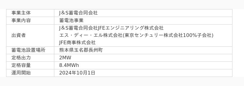 JFEエンジニアリング株式会社(社長:福田 一美、本社:東京都千代田区、以下「当社」)は、エス・ディー・エル株式会社(社長:松田 光生、本社:東京都港区、東京センチュリー株式会社の100%子会社)、JFE商事株式会社(社長:小林 俊文、本社:東京都千代田区)と出資・設立したJ&S蓄電合同会社(本社:神奈川県横浜市)による系統用蓄電池事業(以下、「本事業」)を開始し、事業関係者出席の下、10月18日に開所式典を執り行いました。