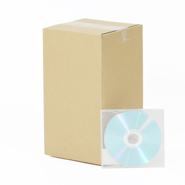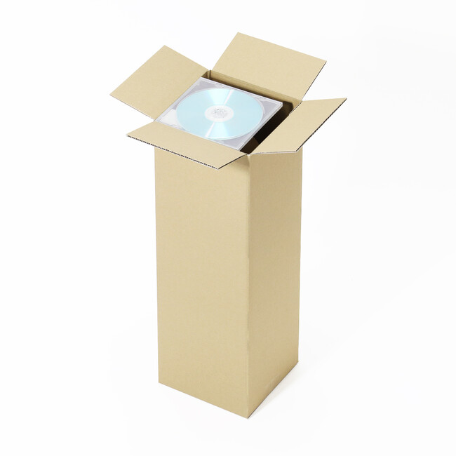 無地で両面茶色のシンプルな仕様をベースに、市販ではなかなか手に入りにくい縦長タイプの段ボール箱。底面は内寸で15cm角の正方形となっており、CDがすっぽりと入る広さを確保しています。