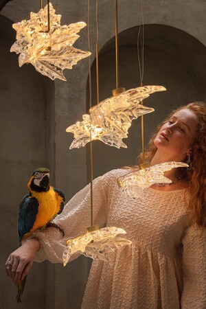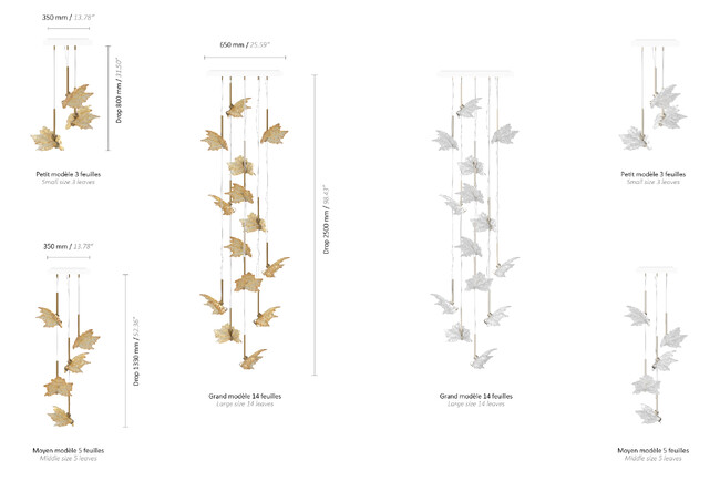 《シャンゼリゼ リアヌ》は、スタジオを代表するプロジェクトです。クリスタルの葉が舞い落ちる蔓(つる)のように、つたい生い茂る植物のように、モチーフの配置やアングルは環境によって異なります。あらゆるインテリアに適応するモジュール式照明へ変換されたアイコニックなクリスタルピースは、細部へのこだわりもユニークです。葉のコンポジションは、長さ、間隔、高さを拡張することができ、クリアとゴールドラスター、2種類のカラーが用意されています。展開はS(3リーフ)、M(5リーフ)、L(14リーフ)のバリエーションの他に、特注のクリエーションが可能です。