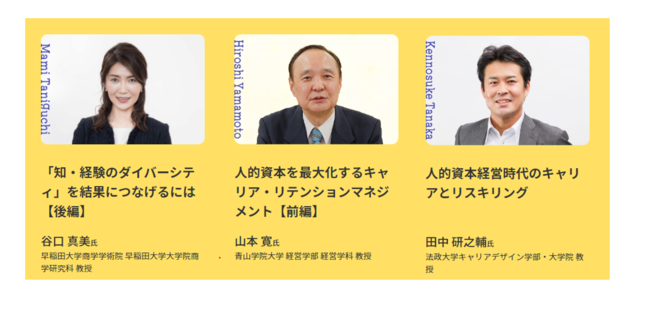 今回公開した「エキスパート解説」とは、人的資本経営や開示の戦略・施策を進めるうえで役立つ考え方やアイデアを人事・人材開発の専門家たちに解説いただいたものです。ダイバーシティを専門とし経産省「人的資本経営の実現に向けた検討会」委員を務める、早稲田大学教授の谷口真美氏、キャリアプラトー研究の第一人者の山本寛氏(青山学院大学教授)、プロティアン・キャリア研究者の田中研之輔氏(法政大学教授)の3名にそれぞれの専門分野の視点で語っていただきました。今後も著名な研究者、実務家に話を伺っていきます。
