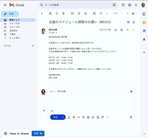 「生成」ボタンをクリックするだけで、返信文章を生成