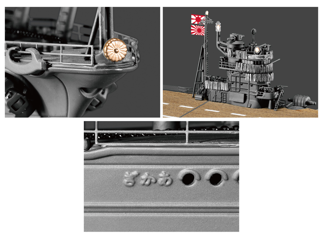 船首の菊花紋章、艦橋に巻かれたマントレット、船尾の艦名「あかぎ」など、ビッグスケールだからこそできる細部のこだわりを徹底的に再現しました。