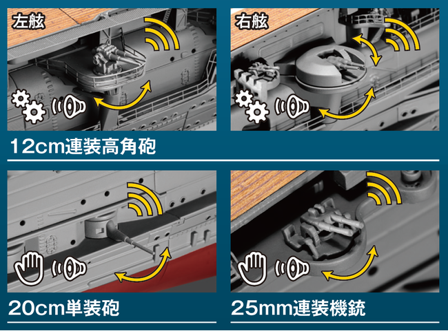 6基の12cm連装高角砲は電動で旋回・俯仰が可能で、砲声と銃声のサウンドもリアルに再現しました。