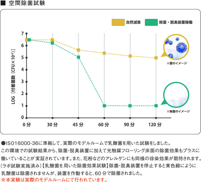 ●空間除菌については、乳酸菌を用いて室内の除菌性能を実験しました。除菌・脱臭装置を停止した状態だと、光触媒フローリングの除菌性能による緩やかな減衰のみが見られましたが、除菌・脱臭装置を作動させると約60分で高い除菌効果が得られることが分かりました。除菌機能については、花粉などのアレルゲンにも同様の効果が期待できます。