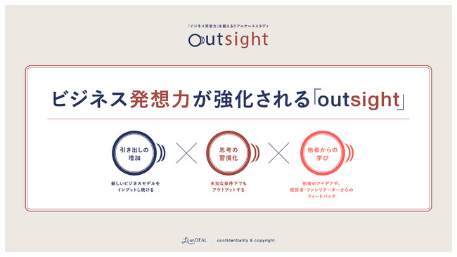 ローンディールが提供する「outsight(アウトサイト)」は、様々なベンチャー経営者が抱える戦略課題に対して、大企業社員100人(最大)が本気で解決策を考え、経営者と直接ディスカッションを行うオンライン越境プログラムです。毎週のインプットとアウトプットにより思考が習慣化されることで、新規事業の立ち上げに必要な発想力やビジネスセンスが鍛えられることをねらいます。