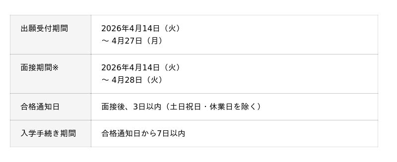 [表1: https://prtimes.jp/data/corp/72233/table/97_1_da1d3a11b75e41fc50b20f5914715a55.jpg?v=202604140245 ]※面接期間内のいずれか1日で面接を実施します。遠方にお住まいの方は、オンラインでの実施も可能です。