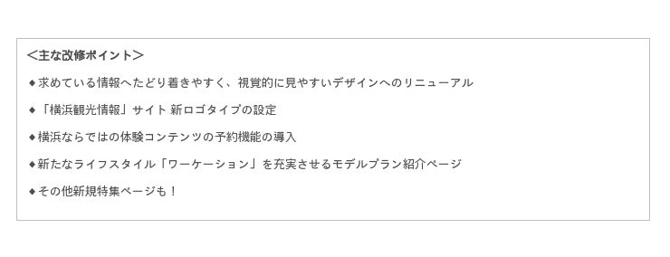公益財団法人 横浜観光コンベンション・ビューロー(以下、YCVB)は、この度、横浜のおすすめ観光スポットや、最新のイベント情報など、横浜観光の情報発信を行うウェブサイト「横浜観光情報」(日本語版)をリニューアルしました。今回のリニューアルでは、利用される方が求めている情報にたどり着きやすくすること、横浜観光のブランドイメージ向上及び実際の横浜来訪に繋げることを目的に、視覚的な見やすさ、分かりやすさにこだわり改修しました。