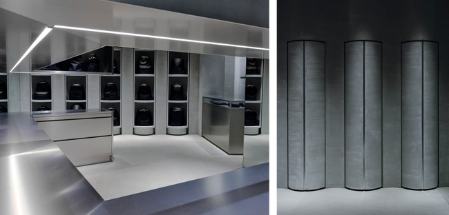 店舗ごとにストアコンセプトを変えるMONOLITH。『MONOLITH NAGOYA』は巨大な銀色に鈍く輝く立方体がそびえ立つ。背後に見える柱状の部分は実は商品棚。回転すると商品が見える仕組みの斬新なデザイン。