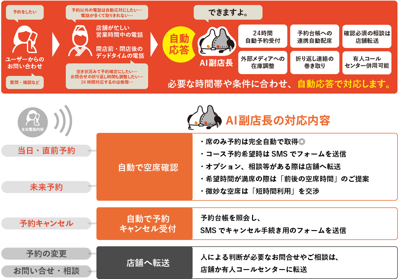 AI副店長は、飲食店にかかってくる電話をお客様との対話から自動で判別し、予約受付やよくあるお問い合わせ対応を担う、飲食店特化型音声対話システムです。