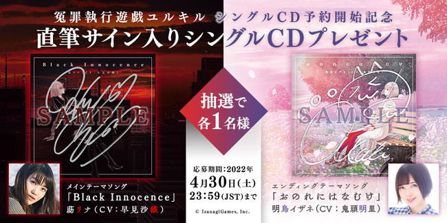 冤罪執行遊戯ユルキル公式Twitterアカウント(@yurukill)をフォローし、対象ツイートをリツイートされた方から抽選で、対象ツイートの声優直筆サイン入りシングルCD1枚を1名様にプレゼントいたします。