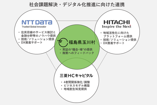 づくり“元気な”たまかわ」のもと、村民と行政の協働による心豊かな村づくりをめざしています。このような状況のなか、玉川村は、人口減少や少子高齢化の加速に伴う労働力不足等の課題をふまえ、2020年から、デジタル技術を活用した新たな事業の創出と、それによる地域振興への取り組みを開始しました。玉川村においては、行政のみならず、地域全体にてDXを推進するため、村民が利便性を実感できる事業モデルの展開を図っています。今回、玉川村と地方創生関連事業等にて協力関係にあった三菱HCキャピタルに、デジタル技術の活用で社会課題を解決する検討を進めていたNTTデータと日立が加わり、地方創生、地域活性化にむけた4者連携に