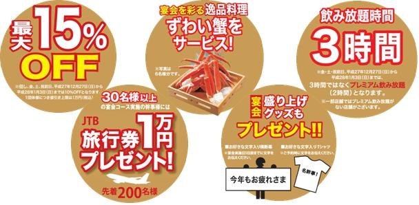 受付期間 平成27年11月30日までに受付のご宴会(11月27日からのご宴会が対象ですが、