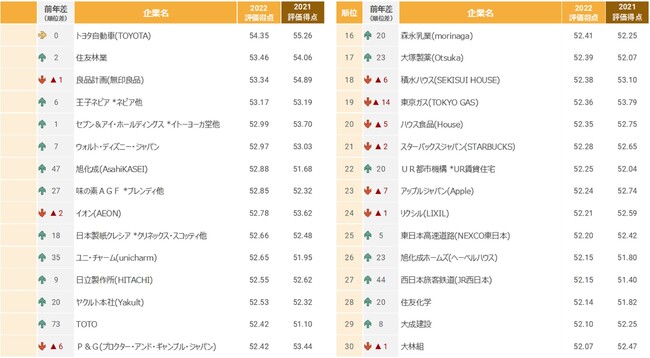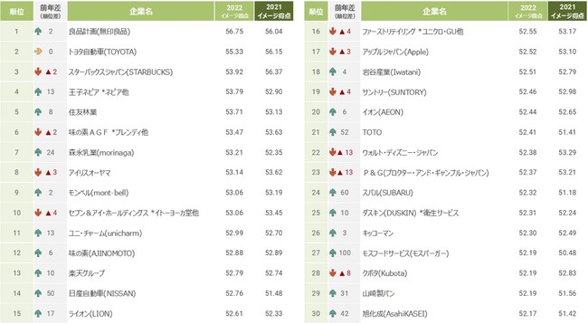 「良品計画(無印良品)」が2020、2021の連続2位からランクを上げ、初めて総合ランキング1位を獲得しました。2年連続1位だった「トヨタ自動車(TOYOTA)」は総合2位に。3位以下は「住友林業」、「王子ネピア」、「味の素AGF」の順に、昨年からそれぞれランキングを上げた結果となりました。