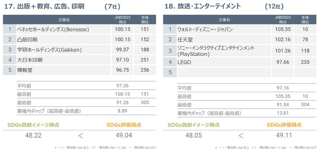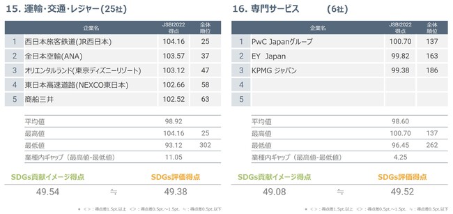 SDGsの17の目標と企業が実際に行っているサステナビリティ活動とを照らし合わせて評価がなされており、サステナビリティに対する具体的な活動内容が認識されている企業が高い得点を得る傾向にあります。