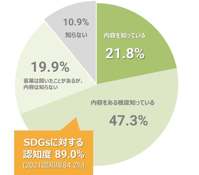なお、表記の円グラフは、JSBIにおける生活者のSDGsの認知度に関する調査結果です。昨年の84.2%から89.0%と更にSDGsに対する認知度が向上しました。