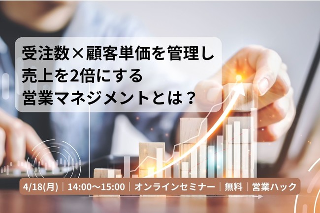 「ご支援先の売上を2年で2倍にする」を掲げ、営業コンサルティング行っている株式会社営業ハック(本社:東京都港区、代表取締役:笹田裕嗣)。そのノウハウと仕組みを解説するセミナーを、4/18(月)14:00〜15:00に開催いたします。複雑な営業をシンプルにわかりやすく「受注数」と「顧客単価」の視点でマネジメントしていく方法をご紹介します。