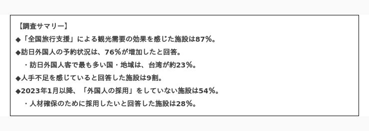 「2023年1月以降に外国人の採用をしたか」との質問に対して「採用した」と回答した宿泊施設は、46%にとどまりました。人手不足を感じているものの「外国人」の採用を行っていない施設は54%もあることがわかります。