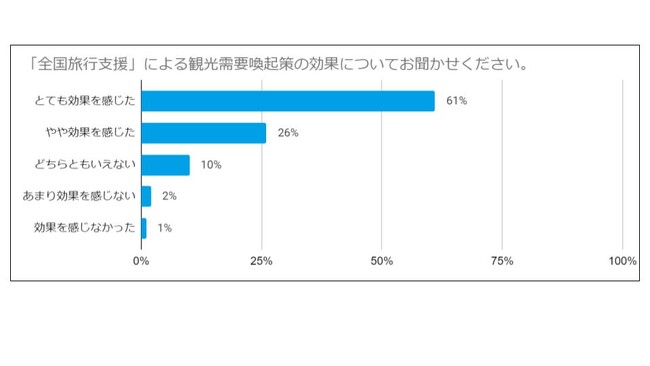 「とても効果を感じた(61%)」、「やや効果を感じた(26%)」の回答を合わせると、約9割の宿泊施設が全国旅行支援について効果を感じていることがわかりました。