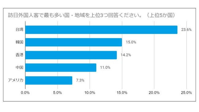 最も多い国・地域は「台湾(23.6%)」、次いで「韓国(15.0%)」、「香港(14.2%)」とアジア圏が上位を占めています。この背景として、旧正月や水際規制緩和の影響により、日本への直行便数が増加したためと言えそうです。