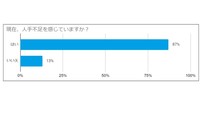「人手不足を感じているか」との質問に対して「はい」と回答した施設は、87%に達しました。多くの施設で人手不足を感じていることがわかります。