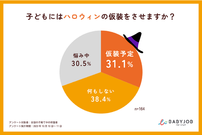 一方で子育てをする保護者164名に対して、子どもにハロウィンの仮装をさせる予定かどうか質問したところ、「仮装させる予定」と答えたのは31.1%で、「仮装させない予定」「悩んでいる」と答えた保護者の方が多い結果となりました。