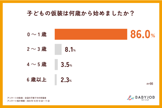 「子どもの仮装は何歳から始めましたか?」という質問に対して、86.0%もの保護者が「0〜1歳から始めた」と回答しており、多くの保護者が3歳以下のうちに仮装を始めることがわかりました。