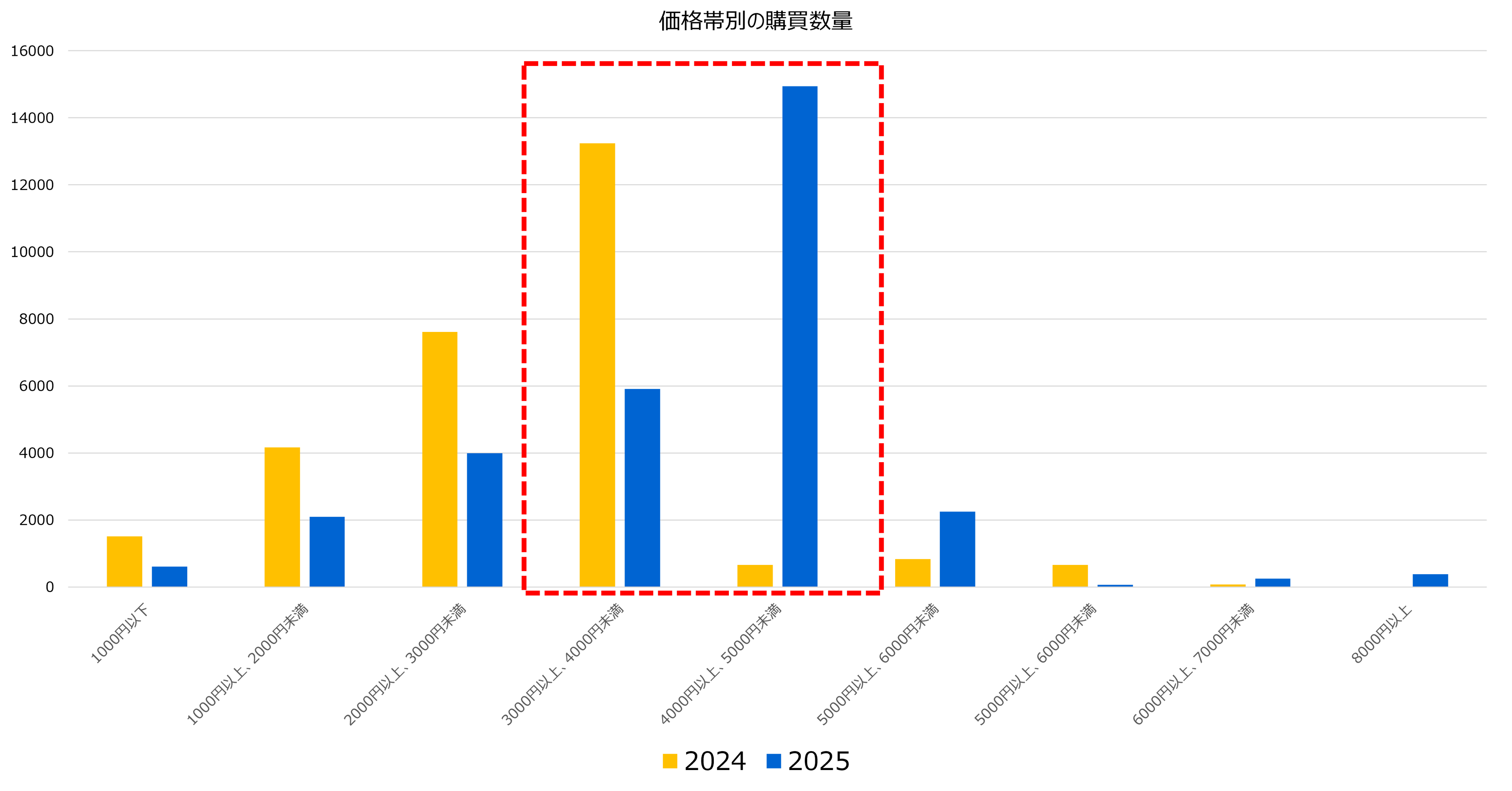 2024年の同時期と比較して、銘柄米・ブレンド米・備蓄米全体での平均購入単価が上昇。最も購入が多かったのは4,000円以上5,000円未満で、前年より1,000円高い水準となりました。