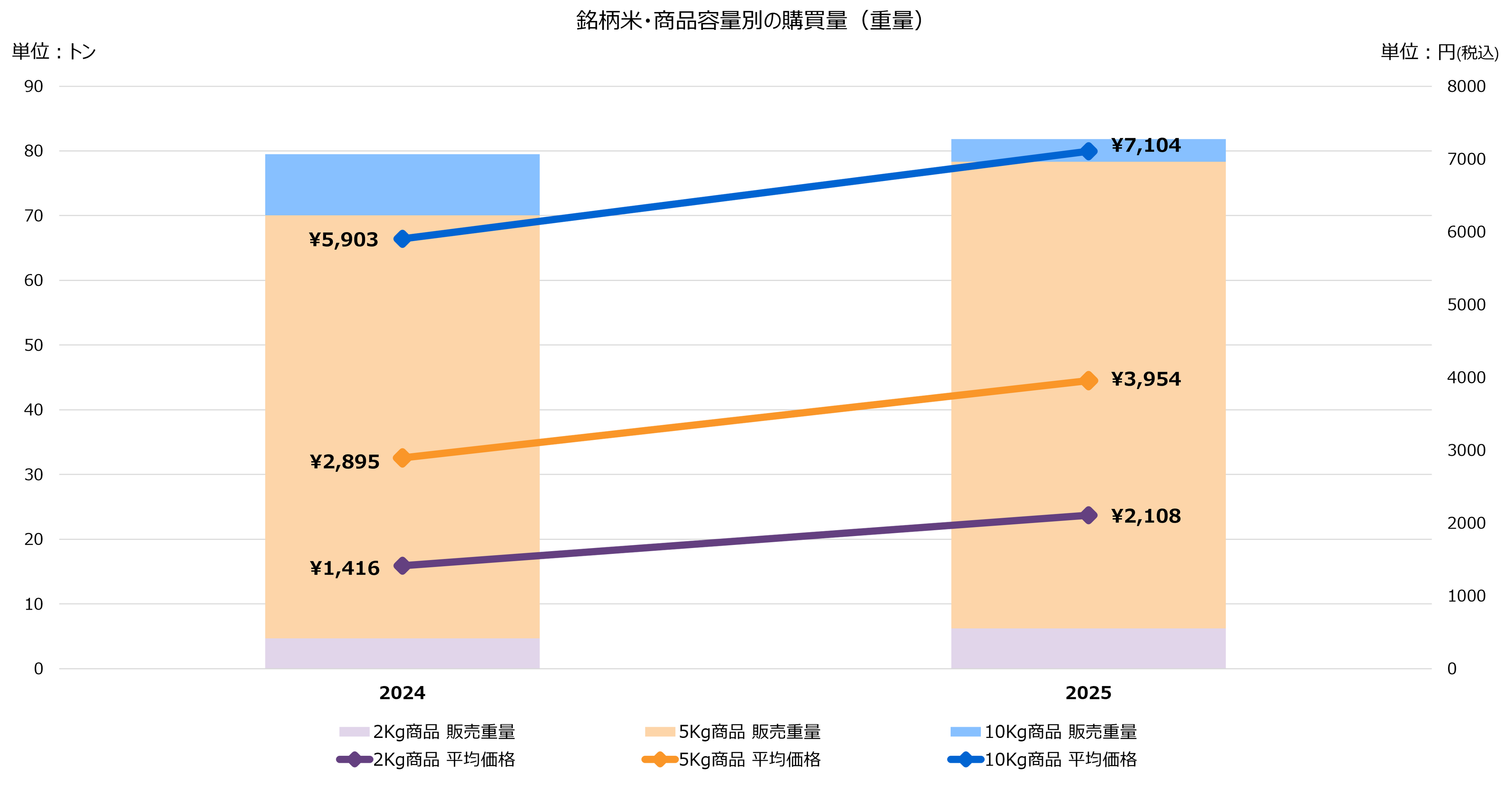 銘柄米の平均価格は全体で上昇傾向。2kg・5kgの商品が、10kgの販売重量減少を補う形となりました。