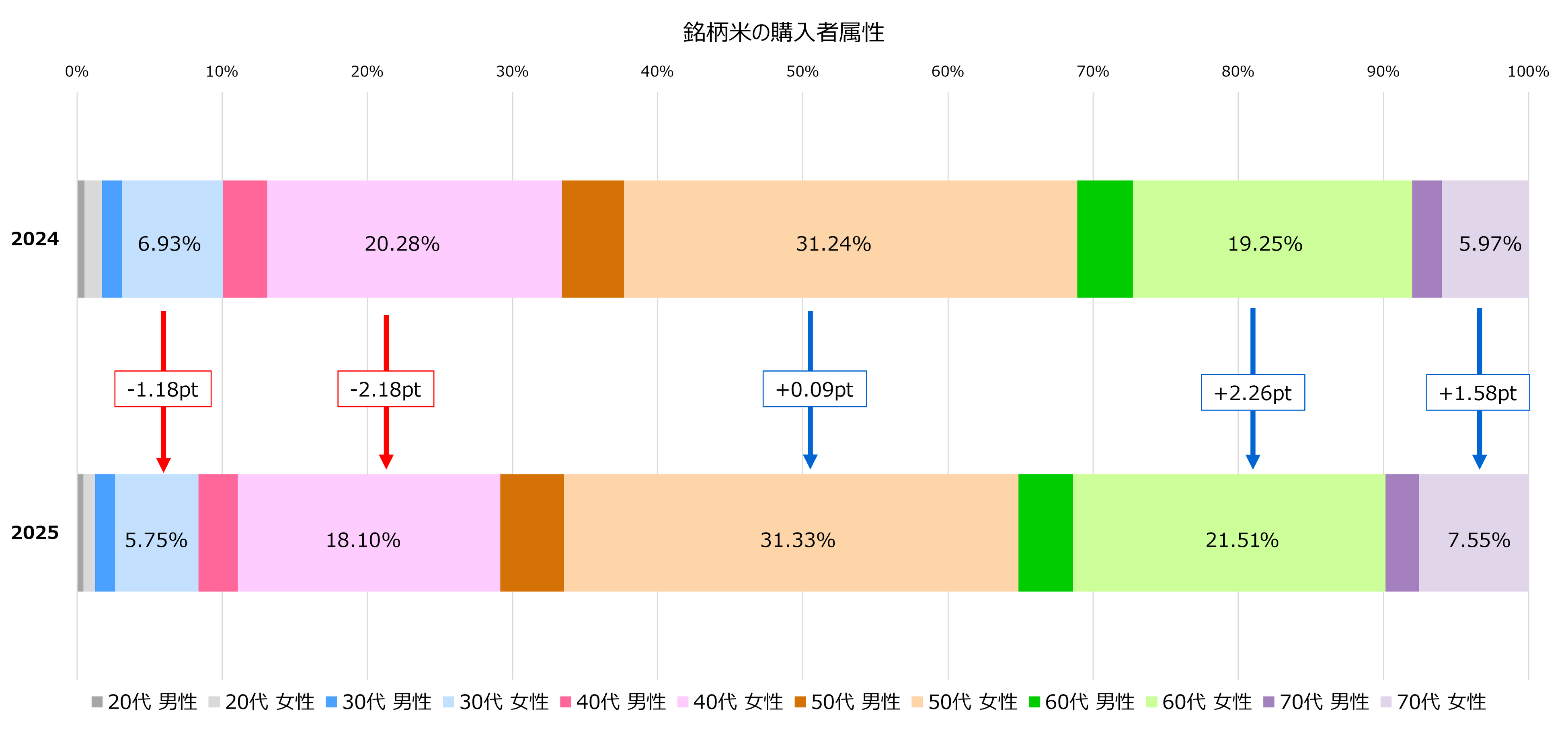 銘柄米における購買は、50代以上の購入が増加の一方で40代以下は減少傾向となりました。