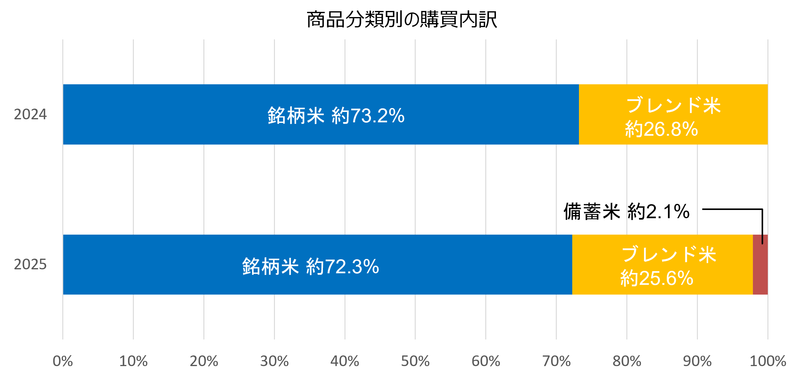 こうした容量選択の変化が進む中でも、銘柄米・ブレンド米・備蓄米における米の購入全体では約72.3%が「銘柄米」を継続購入しており、物価上昇が続く中でも依然として根強い支持があることが分かりました。一方で「備蓄米」の購入は約2.1%にとどまり、日常的な選択肢としては限定的な位置づけとなりました。